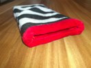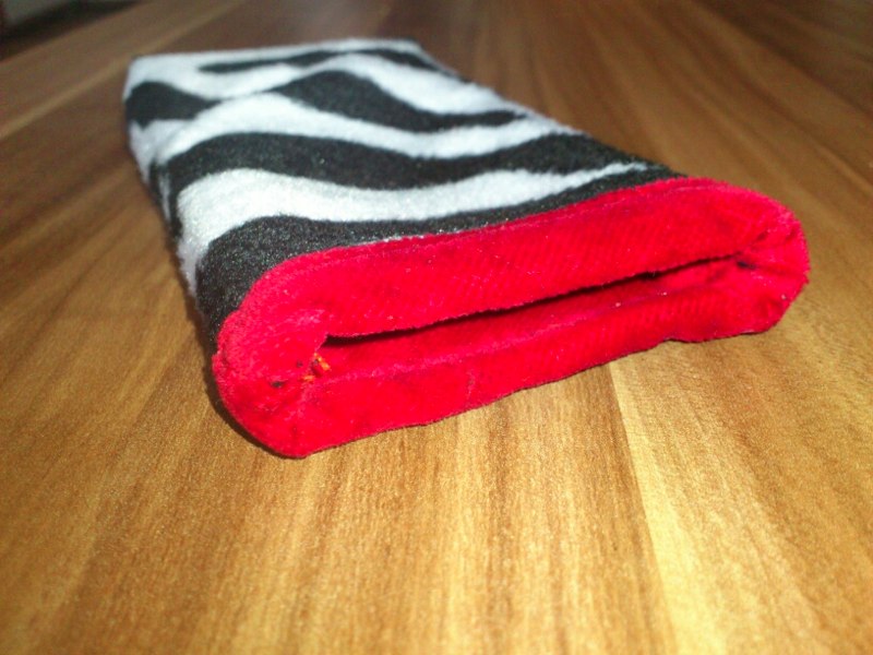Innen ist die Tasche mit Samt royalrot und zusätzlich mit Vlies verstärkt. Aussen findet Ihr den Retrostoff Zebra.