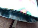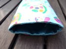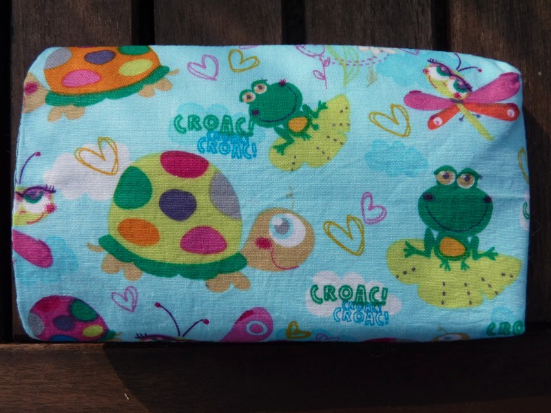 Innen ist die Tasche mit Satin hellblau und zusätzlich mit Vlies verstärkt. Aussen findet Ihr den Baumwollstoff Schildkröte.